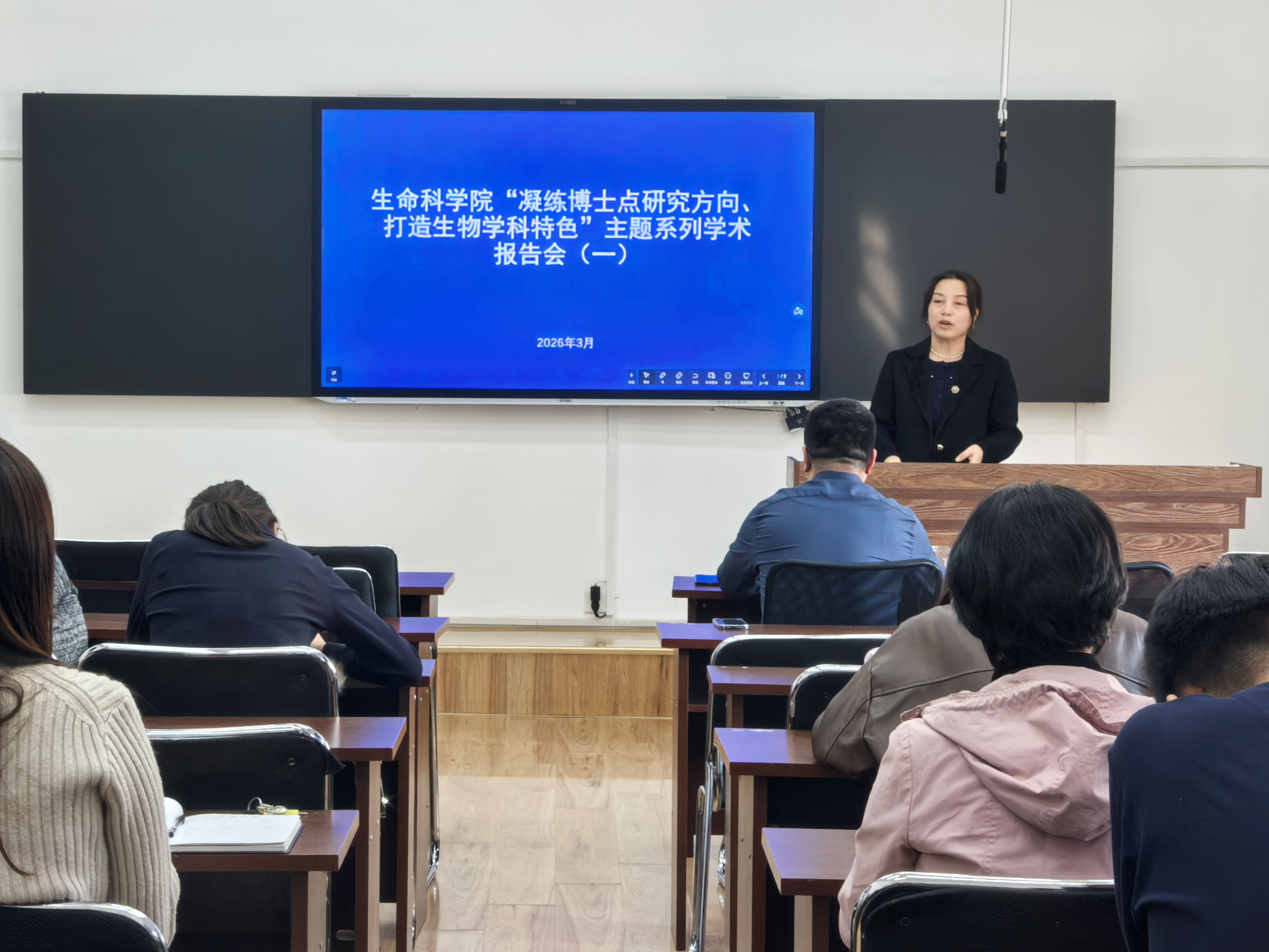 2026年3月27日,9728太阳集团举办“凝练博士点研究方向,打造生物学科特色”主题系列学术报告会首场活动。本次报告会紧扣生物学学科发展前沿,立足学院博士点申报与学科建设核心工作,开展高水平学术交流与研讨。会议由9728太阳集团副院长毕秀丽主持,院长胡风庆出席会议,学院各学科点硕士生导师、硕士研究生共同参与本次学术活动。